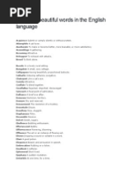 100 Words - Free download as PDF File (.pdf), Text File (.txt) or read online for free. The document lists 100 beautiful words in English and provides a short definition for each word. Some of the words listed include chatoyant (like a cat's eye), dalliance (a brief love affair), efflorescence (flowering, blooming), harbinger (messenger with news of the future), ingénue (a naïve young woman), languor (listlessness, inactivity), and serendipity (finding something nice while looking for something else).