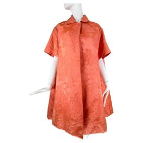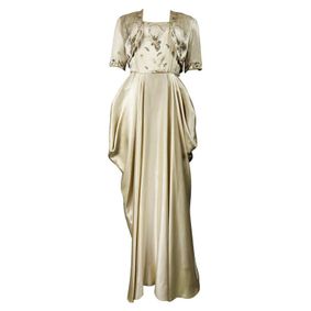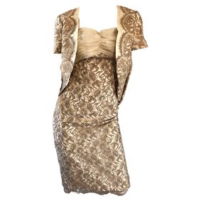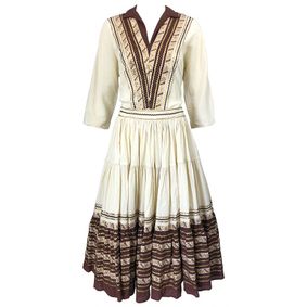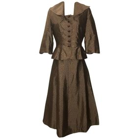 Sensational vintage 1950s demi couture nude French lace dress AND cropped short sleeve bolero jacket! Nearly completely hand sewn, this drop dead bea... ... Beautiful 1950s lightweight silk ivory, brown and gold embroidered tunic and skirt ensemble / patio dress ! Tunic top features brown and gold ric rac and ... ... Brown ditsy floral print skirt suit designed by Jean Desses and produced in the U.S.