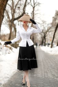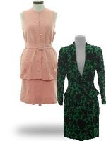 Pictures of women's 1950s suits. Ladies 1950s suit skirt (swing and pencil) and jackets (peplum, scallop, bow, straight) two piece suits fashions