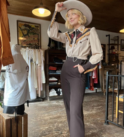 Vintage light & dark brown western suit with fringe/embroidered yoke and cuffs. Collar and yokes have embroidered cacti and steer. In amazing vintage condition with no visible flaws. Shirt includes, shoulder pads, pearl snaps, and front & back pleats making it slightly fitted from waist down. Trousers are classic western style with two front pockets and side zipper closure.