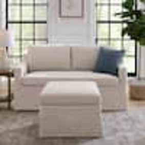 The Home Decorators Collection Brookville 84 in. Classic Slip-Covered Sofa in Bleach White and StyleWell Whaverton Square Arm 2-Seater Loveseat Sofa in Stone Gray (54" W) are exclusive to The Home Depot.