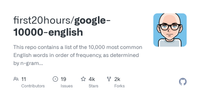 GitHub - first20hours/google-10000-english: This repo contains a list of the 10,000 most common English words in order of frequency, as determined by n-gram frequency analysis of the Google's Trillion Word Corpus.