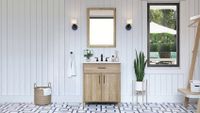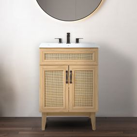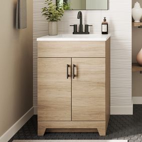 Premium quality 24-in W x 34-7/8-in H x 19-in D natural oak finish vanity and matching 20-in x 28-in mirror · Includes two sets of hardware - matte black (installed) and brushed nickel · Features tilt-down drawer and 2-door cabinet with adjustable ...