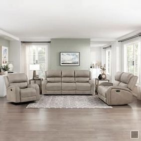 Three-piece manual reclining living ... in warm brown leather-look fabric upholstery with nail head trim. ... Three-piece manual reclining living room set includes a sofa with drop-down table, console loveseat and rocker recliner in versatile gray leather-look fabric upholstery with nail head trim.
