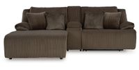 Includes 3 pieces: console with storage, left-arm facing zero wall power recliner and right-arm facing zero wall power reclining back chaise