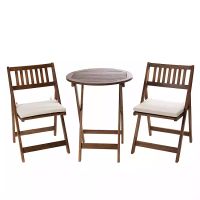Bring a natural element to your outdoor decor with this Acacia Wood 3-pc. Bistro Set with Cushions! You’ll love the rich natural wood finish this set provides. Its convenient folding design allows for quick and easy storage. Set includes one (1) table, two (2) chairs, and two (2) cushions Each chair measures 20L x 17.6W x 32H in. Table measures 24L x 24W x 29H in. Crafted of acacia wood Natural acacia wood finish Slatted wood design All pieces fold flat for easy storage Set includes two (2) cream cushions with ties for chairs Not intended for commercial use Care: Safe for outdoor use. Contact