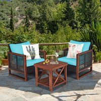 Buy 3 Pieces Wicker Patio Furniture Set with Acacia Wood Coffee Table at Costway, enjoy great savings and discounts with fast, free shipping on everything. • Please avoid rain exposure for longer serving time. · • Package includes 2 sofas, 1 table, 2 seat cushions, 2 back cushions and instruction · • Made of all-weather rattan, sturdy and durable · • Acacia wood frame and unique base provide powerful support · • A coffee table with 2 shelves provides sufficient storage space · • Thick cushions filled with premium sponge offer a comfortable seat · • The cushion cover with zipper can be removed