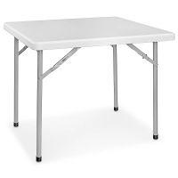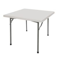 Versatile folding table is perfect for indoors or outdoors. Convenient square, folding table sets up quickly when you need an extra table and space is limited. Blow-molded polyethylene top is water and stain resistant to ensure it won't crack or stain. Strong, durable, powder-coated metal construction withstands dents and scratches. Slide lock feature enhances table stability once opened. Legs fold flush into table creating a flat surface for easy storage and stacking. Non-marring foot caps prevent floor damage. Supports up to 600 lbs of evenly distributed weight.Product Details · Edge Detail