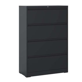 Streamline file storage in your office with this Staples 4-Drawer Lateral File Cabinet in Black. This durable all-metal storage cabinet holds a large amount of letter- and legal-sized documents at your fingertips. A single gang lock at the top locks and unlocks the four sliding drawers at once to ensure only authorized personnel have access to your confidential information. Side-to-side bars allow for easy integration into your existing file system and adjustable floor levellers keep this file cabinet stable.