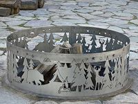 The Wildlife decorative Fire Ring - Northwoods is a high quality decorative and useful accent for a fire pit or campfire. This Fire Ring from P and D Metal Works has an intricately cut design depicting Wisconsin's Northwoods with pine trees, bears, deer, and tents under the moon and stars. Constructed from 12 gauge steel, fire ring is plasma cut unpolished and unpainted. The Fire Ring comes in two sizes, 38 inch or 48 inch diameter (3 piece or 4 piece product), and both being 12 inches high. Includes nuts and bolts. May have rough or sharp edges. Flames rising inside the fire ring produce a me