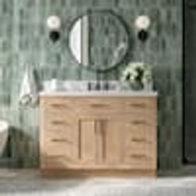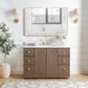 About The Vanity: Elevate your bath by casting a superstar as its lead. The freestanding Marilyn 48" Woodgrain Vanity with Pure White Quartz Top and Ceramic Basin features a warm, wood-grain veneer finish and a genuine quartz countertop. A plywood case and solid-wood construction mean it’s built to last. Plus, it provides essential storage with six spacious, soft-closing drawers with dovetail construction.