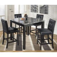 Complete your dining space with the Ashley D154-223 5-Piece Dining Set. It features a spacious faux marble top for a sleek look. The table is supported by square block legs for support. Four complementing chairs complete this dining set. It features vinyl upholstered back and cushion that offer a posh look. The chairs are supported by tapering front legs and splayed back hind legs. The Ashley D154-223 5-Piece Dining Set is finished in black making it suitable in all interiors.FeaturesSquare faux marble table top offers a polished look Sturdy square block legs provide support 4-vinyl upholste