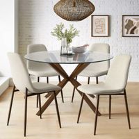 This 5-piece dining set features a round 48" beveled glass tabletop supported by a robust espresso-finished acacia wood pedestal base. Four cream-upholstered linen chairs offer both comfort and style with detailed nailhead trim and sturdy hardwood frames. The set accommodates up to four people, ...