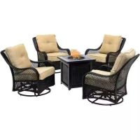 Product Features: Set includes 4 armchairs and 1 fire pit Lattice back chairs Comes with Olefin textilene fabric cushions Also includes glass beads for fire table Rust-resistant steel frame Propane fire pit is CSA cerified Integrated push-button ...