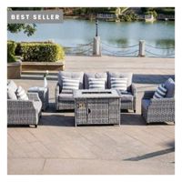 The seating pieces each have a frame made of steel covered in a weather-resistant wicker rattan in a deep brown espresso. We love that it comes with eight foam-filled cushions with removable, machine-washable blue covers. Best of all, the round table converts into a propane fire pit for a rustic touch with an adjustable flame. This outdoor conversation set complements any design style, from traditional to industrial to modern.
