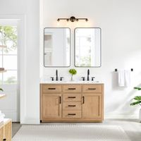 This classic double-bathroom vanity set features clean lines and plenty of drawer space for all your makeup, toiletries, and cleaning supplies. Its wide 54" design is made from solid poplar wood in a neutral finish, and its surface is crafted ...