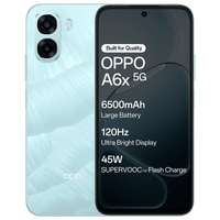 Storage: 6 GB RAM, 128 GB Internal Memory,Display: 17.14 cm (6.75 Inch), LCD,Rear Camera: 13 MP,Front Camera: 5 MP,Processor: Dimensity 6300,Battery: 6500 mAh, 45 Watts Charging, and more in the Oppo A6x 5G 128 GB, 6 GB RAM, Ice Blue, Mobile Phone