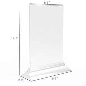 Clear acrylic, T-base countertop sign holders allows two-sided viewing. Signs insert easily from bottom. 1/8" thick acrylic. Holds 8.5 x 11 signs vertically