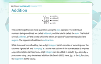 March 5, 2026 - Addition, usually denoted with the plus sign +, is one of the four basic operations of arithmetic, the other three being subtraction, multiplication, and division. The addition of two whole numbers results in the total or sum of those values combined. For example, the adjacent image shows two ...
