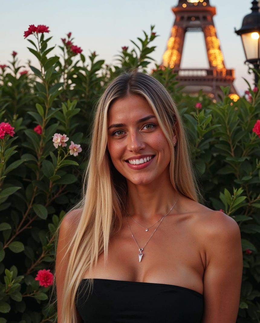 Prompt: โfront view of model wearing a strapless black top and a delicate necklace. the model is smiling and positioned in front of a lush green bush adorned with red and white flowers. in the background, there is a lit-up eiffel tower and a classic lamp post against a clear evening sky.โ