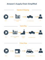 This Amazon supply chain diagram depicts the various modes of shipping available to the supplier. Standard shipping, same-day shipping, and prime now shipping are part of the supply chain management process.
