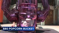 The “Fantastic Four” bucket is 20 inches wide with the horns of Galactus' helmet attached, 17.5 inches tall and 9.6 inches deep—so big that the theaters are warning online buyers shipping "will cost a bit more than usual." A regular, refillable large popcorn bucket at AMC Theatres is about 150 ounces, making the $80 novelty more than twice as big. The bucket is just one of the custom containers made for “First Steps” and is available starting Thursday in Cinemark, AMC, and Regal theaters (and on their websites starting July 26, Aug. 1 and Aug. 14, respectively). Other novelty concession items made for "First Steps" include an 85-ounce "Fantasticar" popcorn bucket sold by Regal for $57, a Mr. Fantastic bucket from Cinemark ($58) limited-edition pint glasses from Alamo Drafthouse.