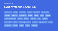Some common synonyms of example are case, illustration, instance, sample, and specimen. While all these words mean "something that exhibits distinguishing characteristics in its category," example applies to a typical, representative, or illustrative instance or case.