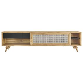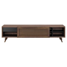 The mid-century inspired TV stand blends vintage and modern styles, with wave-shaped doors and wood grain for a more designer and textured look. Its cord holes for easy access to power and placement of cords, the large cabinets can accommodate ...