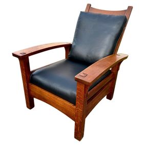 Beautiful and long-lasting, Stickley furniture was made from high-quality wood and treated with clear dyes, to allow the natural grain to show. Affiliated designers include Gustav Stickley. ... Gustav Stickley Antique Mission Oak Arts & Crafts Open Arm Reclining Morris Lounge Chair, Circa 1910 | $3,795
