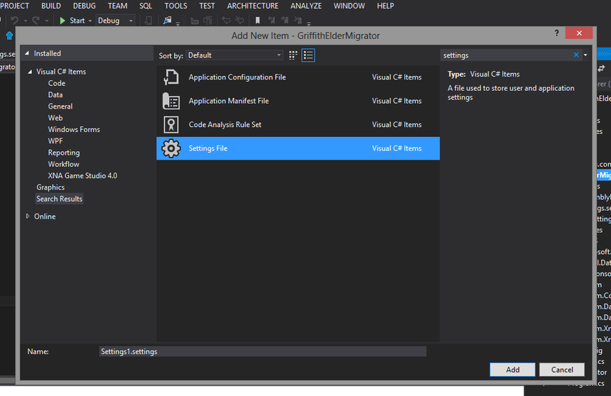 - renamed the settings file to something useful - mine was "Settings.settings"