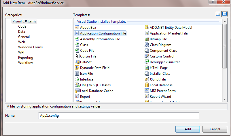 Right click on application->Go to Add->you will see the exact picture What i have attached here->Pick the Application Config File.