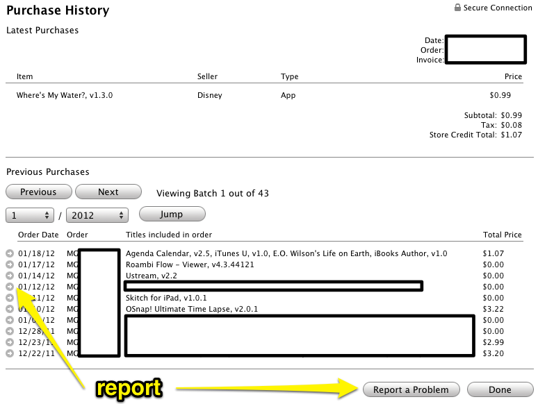 Answer (1 of 4): You may request refund or report issues at http://reportaproblem.apple.com. Once you made a selection to request refund or otherwise, you will be given a list of options to choose from: From there you will be able to lookup your receipt number (for the purchases). If you request...