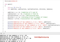 printf("Sum: %d\nDiff: %d\n", ops'+', ops'-');