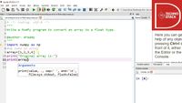 August 29, 2025 - Write a NumPy program to convert an array to a floating type. ... # Importing the NumPy library with an alias 'np' import numpy as np # Defining a Python list 'a' containing integers a = [1, 2, 3, 4] # Printing the original array 'a' print("Original array") print(a) # Converting the array 'a' to a NumPy array of type float using asfarray() x = np.asfarray(a) # Printing the array 'x' after converting to a float type print("Array converted to a float type:") print(x)