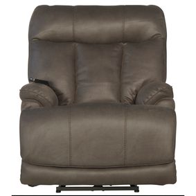 Big and bold, this power recliner with Easy View power adjustable headrest delivers comfort at the touch of a button. Easily position the recliner, its headrest and lumbar support to your liking for maximum comfort. Plus, with the convenient USB charging port, a cell phone or laptop can be charged without having to get up. The feel of heavy weight leather surrounds you via the cushioned seat, interior bustled back cushioning and pillow top armrests, while faux leather is on the back and sides for affordability. The cloud effect seen in the smoke-colored upholstery creates a rustic look, perfec