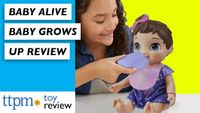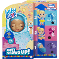 As a baby, Baby Alive Baby Grows Up talking doll sits up and says her first word. Kids can help her grow with pretend pouch feeding and bouncing movements. Hold her hands and help her standnow shes a big girl who loves playing dress-up! Wow, her hair gets long when you use her brush and pull to extend it! The instructions and quick start guide help kids learn to care for their growing doll at every stage and reset her to play again!