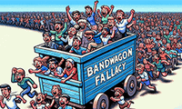 The name originates from the 19th-century practice of political supporters jumping onto a candidate’s bandwagon—literal wagons carrying musical bands during rallies—symbolizing joining a popular movement without critical evaluation.