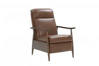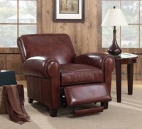Classic push thru the arms recliner with articulated head rest area for extra head support, nail head trimmed wings, arms and footrest. Pocketed coil welted box seat cushion and mahogany finished wood legs complete this sophisticated look with comfort and style.Features:• Leggett and Platt Activated not operated, Mechanism• Hardwood Plywood, Mortise & tenon frames w/ glued joints & corner blocking• Leather features distinctive design and luxurious feel• Superior individual pocketed coil Springs in seat cushion• Wrapped in foam padding fully enclosed in fabric casing• High resilience seat foam