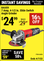 BAUER 7 Amp, 4-1/2 in. Slide-Switch Angle Grinder for $26.99 – Harbor Freight Coupons