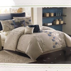 ESCA Home presents the comforter set with soft microfiber  fabric. The contemporary embroidery look gives your bedroom a complete make-over, matching décor pillows make perfect additions.  Queen Comforter: comforter 90"X 90", Two Pillow shams: 20"X 26", Cushion 1: 16"X 16", Cushion 2: 16"X 16" Breakfast Pillow 12"X 18", Décor Pillow 9"X 20". King & Cal King Comforter: comforter 104"X 90", Pillow shams: 20"X 36", Cushion 1: 16"X 16", Cushion 2: 16"X 16" Breakfast Pillow 12"X 18", Décor Pillow 9"X 20"