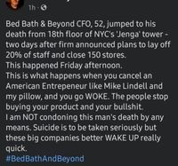 There's a common thread of reporting here: "the CFO of Bed Bath and Beyond died by suicide." But what's more interesting to me is the attempts to correlate the suicide narrative with negative sentiment about BBBY as a company. There are 2 potential reasons why the authors of these articles are attempting this correlation, either to attempt to analyze why Gustavo committed suicide or to push a narrative that BBBY underperforming is the reason for his death.