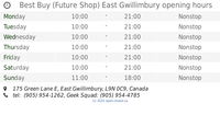 Add it to your website, your phone or even your desktop - opening times, phone numbers and the road to Store of the Best Buy (Future Shop) In East Gwillimbury, 175 Green Lane E. Bank Holiday Opening hours / times Easter Opening hours / times Xmas / Christmas Eve / Boxing day / New years Opening hours / times Apologies, this Store does not provide them with a holiday to the opening times.