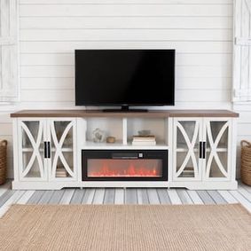 Rounded wood trim on each corner adds a smooth visual detail and extra durability. This floating stand keeps the floor area open, making it easy to clean and ideal for people who want to add their own LED light strips underneath. Looks very sleek, just darker than I thought it would be.. Anonymous. Fri Nov 28 2025 ... Transform your living room with a 70" farmhouse TV stand supporting TVs up to 80". Features a 37" electric fireplace with 7 flame colors, adjustable heat, and a timer for year-round use.