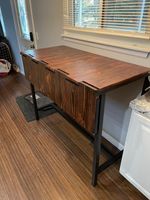 I don’t have a lot of storage in my apartment so it needs to be foldable so I can store it in a closet (like a card table with folding legs) and it also needs to be counter height so I can use my existing kitchen island stools. I know there are actual card tables with adjustable heights, but I would prefer something that looked a bit nicer.