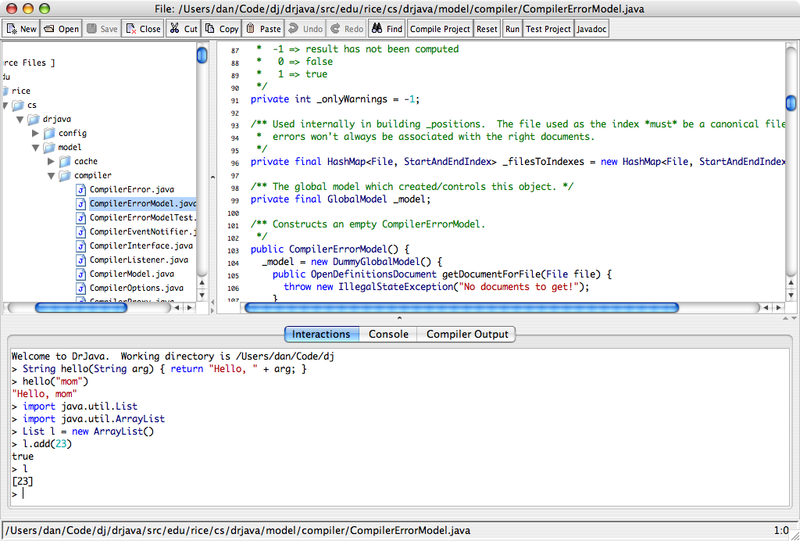 DrJava is a lightweight IDE for the Java programming language. Designed primarily for beginners and actively developed and maintained by the JavaPLT group at Rice University, its interface uses Sun Microsystems' Swing toolkit and therefore has a consistent appearance on different platforms.