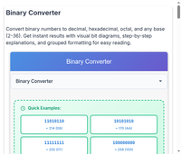 A binary to decimal converter is an online tool designed to convert a binary number into its equivalent decimal number. This tool simplifies the process of binary-to-decimal calculations, making it both easy and hassle-free for us. By just entering a binary number, we can quickly get its decimal ...