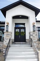 Brick steps lead up to a black front door with glass panels and sidelights complementing gorgeous white home accented with a light gray roof and black framed windows. Kelly Caron Design ...