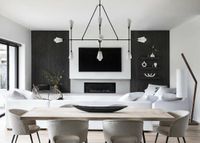 All elements of the room, such as the rug, cushions, furniture and lighting have been carefully selected to tie in with the overall colour scheme, creating a smart and cohesive design. ... This modern and stylish black-and-white room sticks with a very neutral palette across the entire room, with the only non-black furniture or white accessories being cushions and the circular off-white rug. All three forms of lighting have been used in this living room interior design, ambient, task and accent.