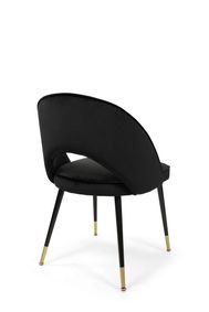 A modern dining chair featuring a curved silhouette, matte black legs, and neatly tailored upholstery. ... A sleek black velvet accent chair featuring polished nickel metal arms and a crisp, tufted seat.