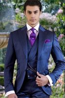 4-piece navy blue pinstripes suit with jacket, waistcoat, pants and skirt ... "Item matched the description perfectly. Lovely soft material. Arrived quickly. One size up from measurements was a more regular instead of slim fit. Will definitely look to this seller in the future if the need for a great suit arises." Men Suits Blue 3 Piece Slim Fit Two Button Wedding Groom Party Wear Coat Pant, Men Blue Suit, Blue Slim Fit Peak Lapel Pinstripe Suit
